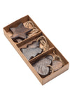 Ensemble de 6 décorations à suspendre effet bois brûlé. Le mélange d'arbres, de cœurs et d'étoiles constitue la combinaison parfaite pour la décoration de Noël. 24 x 10 x 4,5 cm Bois de manguier Fabriqué pour Namaste sur la base du commerce équitable par des artisans qualifiés du nord de l'Inde.